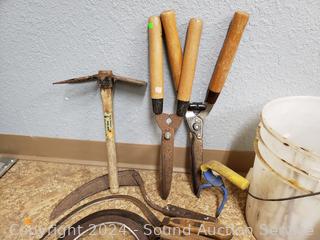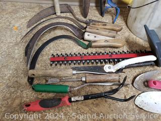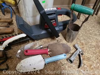 Craftsman 16" hedge trimmer (appears to be functioning as intended), various garden digging, cultivating, trimming tools.