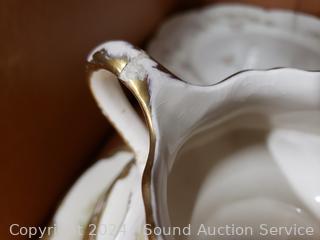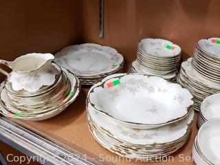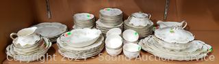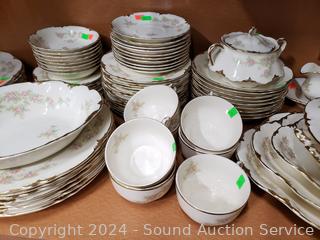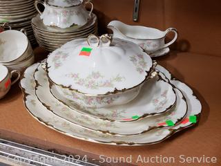12 Dinner plates, 11 salad plates, 11 snack plates, 11 saucers, 7 cups, 10 berry bowls, creamer, sugar, 11 soup bowls, 8.25" round serving bowl, 8" covered server, 12", 14", 16" platters, gravy boat w/drip tray. 15 pieces with noticeable damage.