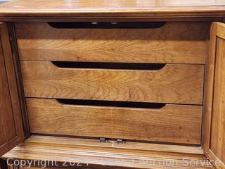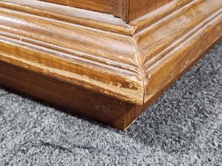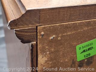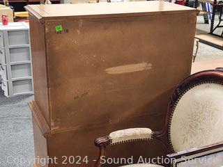 Appears to be solid wood construction, dovetail joinery. One of the drawers is divided. Don't see any major issues. 51" H x 41" W x 20" D.
