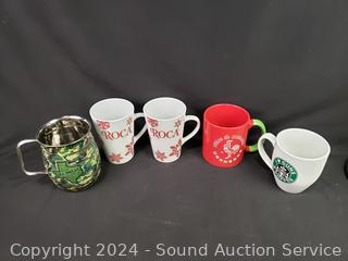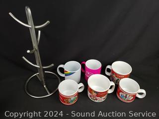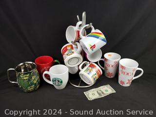 Starbucks, Campbells, Tin & other mugs. Steel Mug Rack.