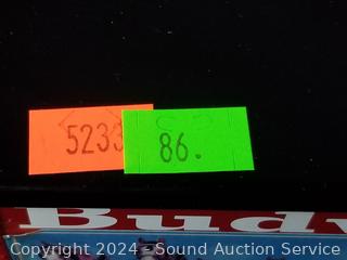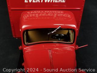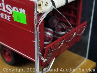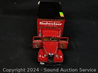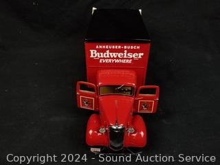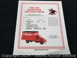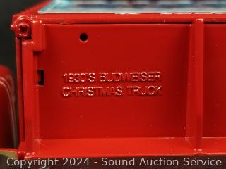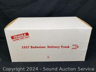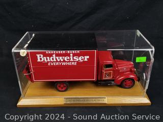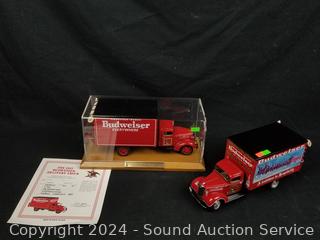 One with display case, acrylic on case is cracked, damaged. Danbury Mint 1930's Budweiser Christmas Truck & 1937 Budweiser Delivery Truck with display, CoA & original box.