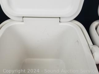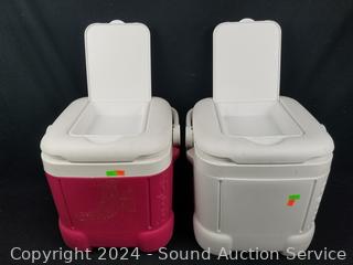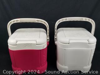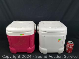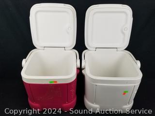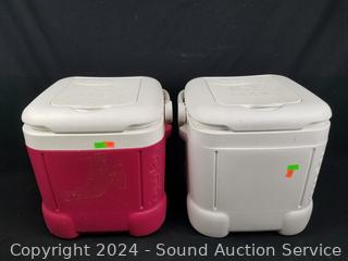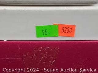 11.5" H x 10.5" x 10.5". Some residue on pink cooler, some scuffs, scratches.