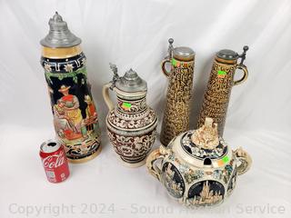 Tureen marked 1943 Germany, 6.5" x 7.5" Dia, no ladle. 3 of the steins marked Germany, one is unmarked. Don't see any issues. Approx. 12.5" to 17.5" tall.
