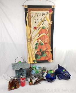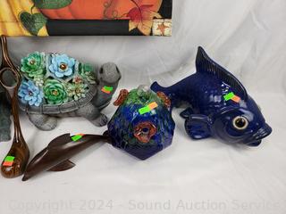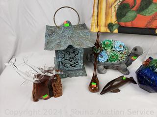 Solar turtle light (untested), Art glass Hummingbird feeder, cast metal candle lantern, carved wood golf club, ironwood dolphin, art glass dolphins mount too wood base, art pottery fish, "Autumn" tapestry/flag.