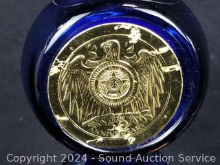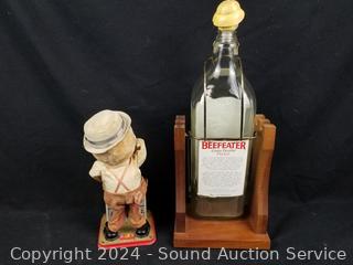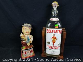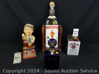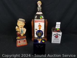 Charlie Weaver Bartender Light Figure (has a light in face that lights up, unsure if it does anything else), American Legion 50th Anniversary Cobalt Decanter, Beefeater Dry Gin 1 Gallon Bottle w/Stand, Acrylic Jim Beam container.