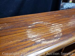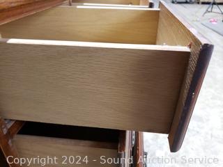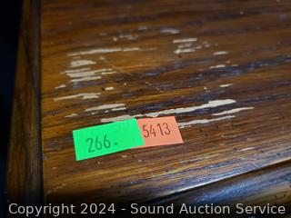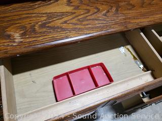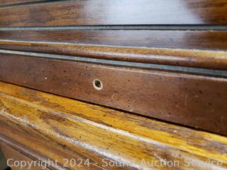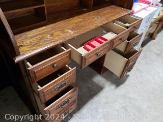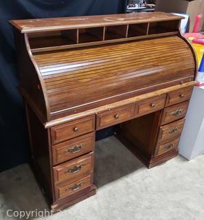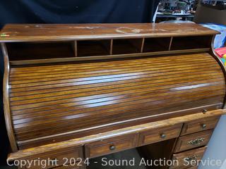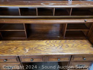 Missing a knob/pull on rolltop, 7 drawers, some scuffs, wear, to finish, some stains, markings in a few of the drawers. 47.5" H x 49.5" W x 22" D.