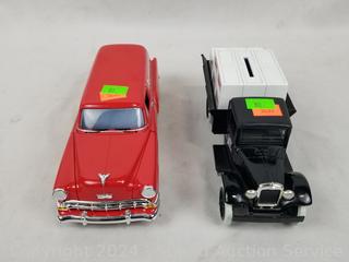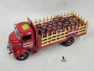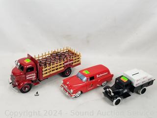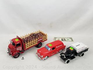 1931 Hawkeye Rainier Delivery Truck, 1954 Chevy Budweiser Coin Bank, Danbury Mint 1938 Budweiser Delivery Truck (license plate is broken off, comes with piece).