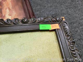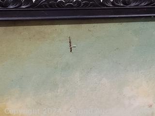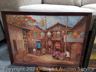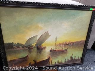 Boats in harbor has a hole in canvas, signs, unable to make out, 20" x 25.5". Bird Market signed M.Siein, painted on canvas, 18" x 24". Old Man & Women Portraits, painted on velvet, don't see a signature, 15" x 20.5". All with various scuffs on frames. Refer to photos for more details.