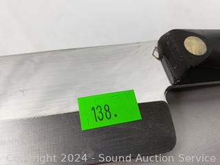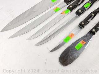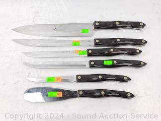 #1768KD Spatula Spreader, #1721 Trimmer, (2) #1729 6-3/4" Petite Carver (one has a broken tip), #1723 9" Carver, #1725 9-1/4" French Chef's Knife. Signs of wear from use.