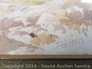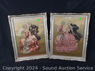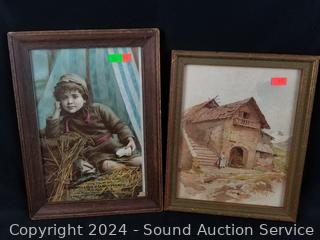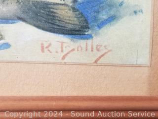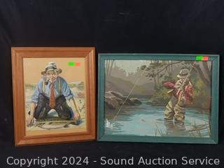 2pc Vintage Needlepoint Ball Artwork w/silver gilt frames 16.5" x 13". Fly Fisherman Painting, don't see a signature, 11.5" x 15.5". Signed Pierron country cottage print?, 8" x 10". "Penter & Siigs? Rubber Good Advertisement Print 8.5" x 11.5". R.Tyolley Fisherman Print, 10" x 12".