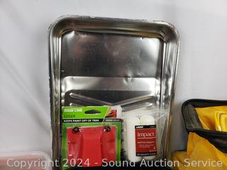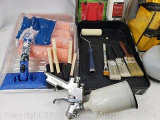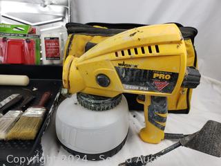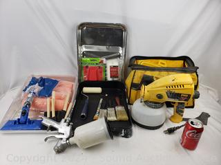 Wagner Pro 2400 PSI (various wear, untested), paint trays, brushes, sponges, rollers, Husky HVLP spray gun.