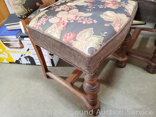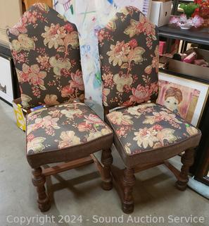 Turned front legs, wood looks old believe antique chairs that have been refurbished with embroidered floral material. 45" H x 20" W x 19.5" D.