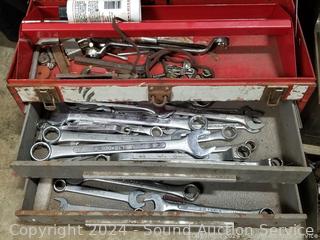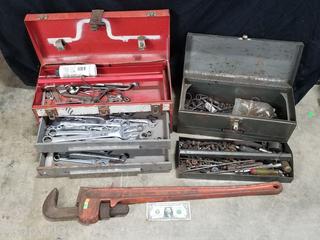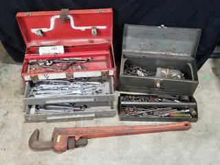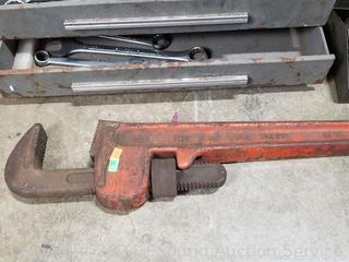 17" & 20" toolboxes, both full of various hand tools. 36" pipe wrench. Refer to photos for more details.