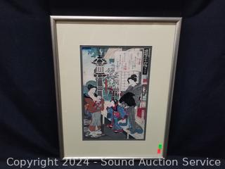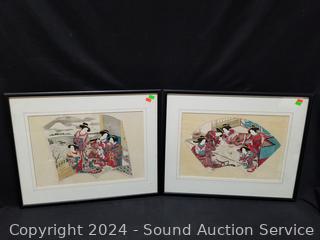 One with artist info on the back Ukiyo-e Printmaker "Kunichika 1835-1900". Refer to photos for more details. Approx. 27" x 21". Refer to photos for more details.