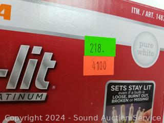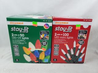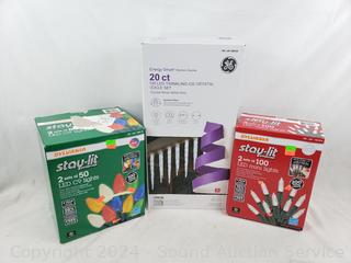 2 sets of 50 C9 LED RGB lights, 2 sets of 100 LED Pure White Mini Lights & 20ct 100 LED Twinkling Icicle set. All appear to be functioning as intended.