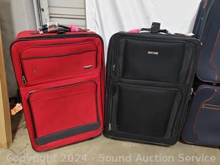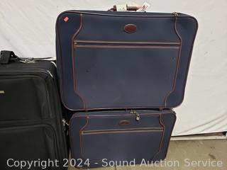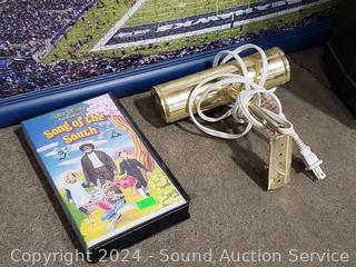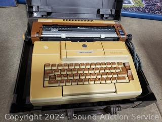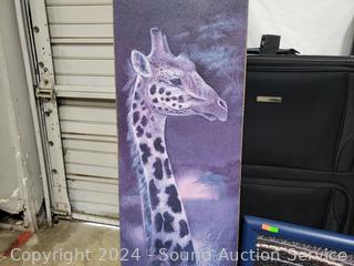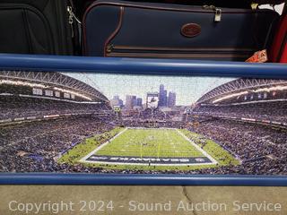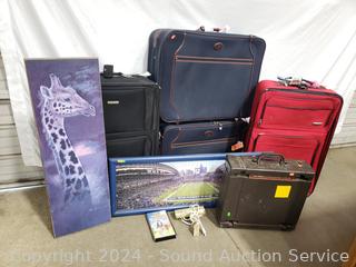 Framed Seahawks puzzle, 4 suitcases (some scuffs, wear to finish), giraffe print, Smith Corona electric typewriter (has power, otherwise non-functioning). Cart not included. ATTN: Items may be missing pieces, damaged, not functioning, complete, no issues, etc. All items as is. Refer to photos for lot contents.