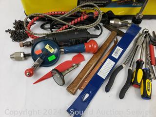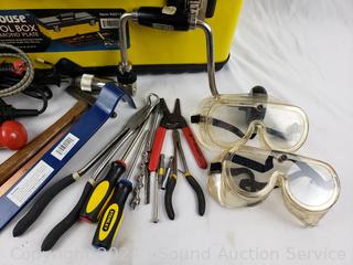 Comes with a set of Pittsburgh SAE 5/8" t0 1-1/4" wrench set, rotary tool, brace, hand drill, screwdrivers, eye protection. All in good cosmetic condition. Refer to photos for more details.