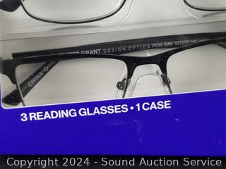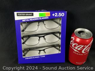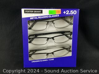 Lot #0100: 3 Foster Grant Metal +2.5 Reading Glasses w/1 Case