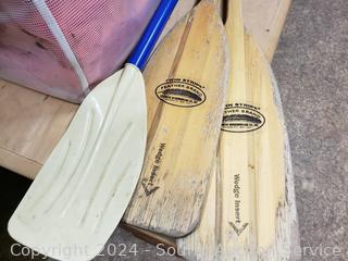 2 Feather Brand Wood Paddles, various wear from use. Plastic paddle. 4 life jackets with case.