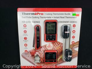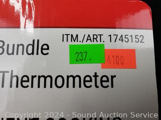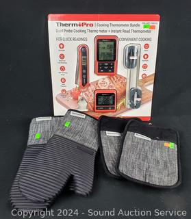 Black mitts, potholders, one mitt has a tear in rubber by logo. Thermometer pack appears to be factory sealed.