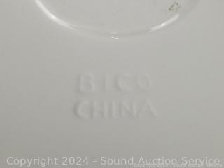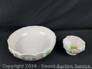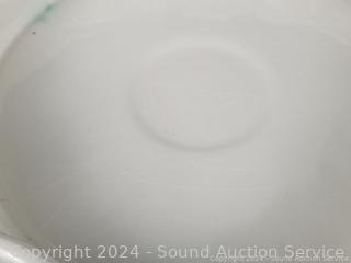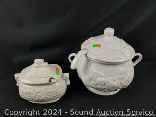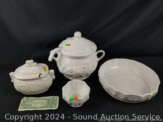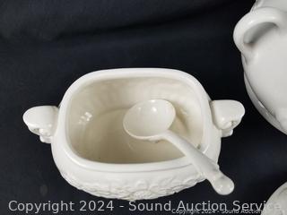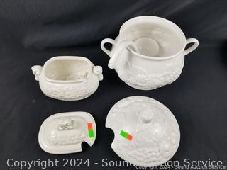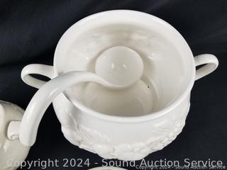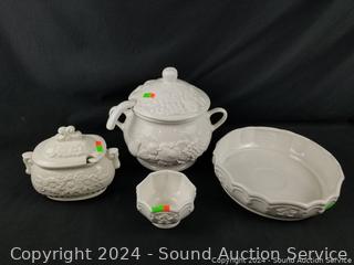 Soup tureen, w/ladle, 10" centerpiece bowl, small covered dish w/ladle, 4" dish. Don't see any major issues.