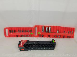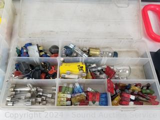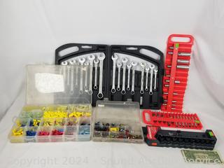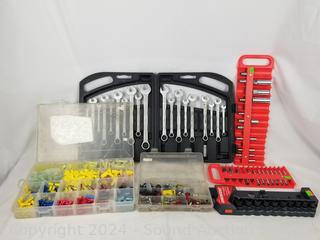Magnetic socket holders w/sockets, Complete Stanley SAE/MM wrench set, Crescent Pass-thru socket set 3/8" 10mm to 3/4" 19mm, electrical connectors, assorted fuses. Refer to photos for more details.