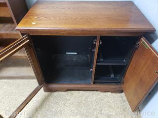 Slide out DVD racks, door hinge is loose, need to lift it to close properly, appears to be missing shelves. Some signs of wear to the finish. 32" H x 36" W x 20.5" D.