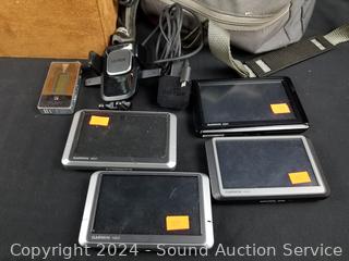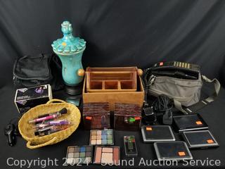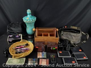 Assorted Cosmetics, pottery urn, navigation devices, vtg brick phone, household organizers & more. Refer to photos for more details.