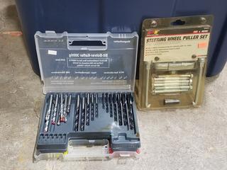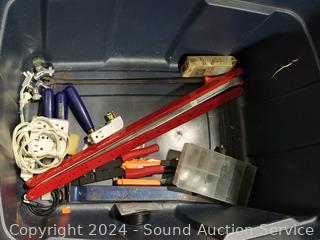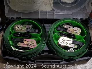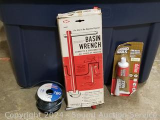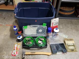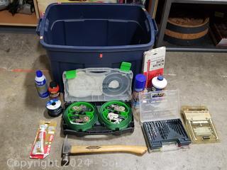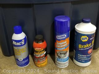 4pk Tie Down Straps w/Quick Storage Case (automatically winds them up for easy storage & use, very cool), steering wheel puller kit, 300pc anchor set w/drill & screw bits, basin wrench, Stiletto titanium 14oz framing hammer, engine cleaner, carb cleaner, brake fluid, liquid nails, electrical wiring & more.
