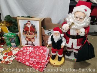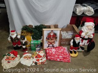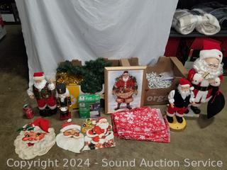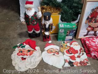 Santa figures, wood nutcracker, twinkling net lights, wall decor, faux garland & more. Refer to photos for more details.