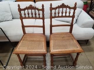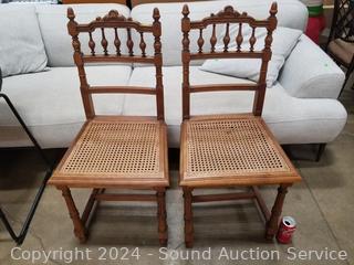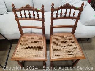 Mahogany construction, turned legs, supports with cane bottom, one has a break in cane. Both a bit wobbly. 36" H x 17" W x 18" to seat.