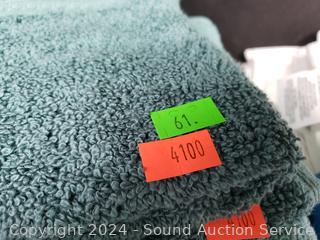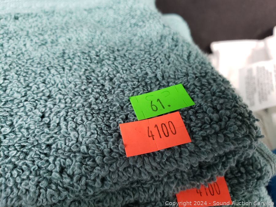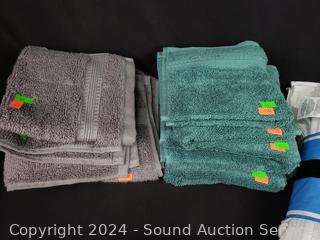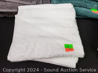 (12) White Grandeur Hospitality, Purely Indulgent = (5) Green (3 washcloths, 2 hand towels), (3) Gray (2 washcloths, 1 hand towel, (2) White washcloths. Some small snags, don't see any major issues.