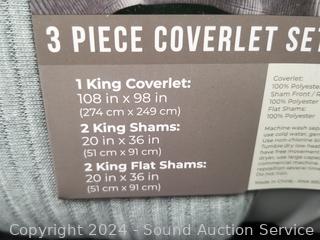 1 king coverlet 108" x 98", 2 shams 20" x 36". Appears unused.