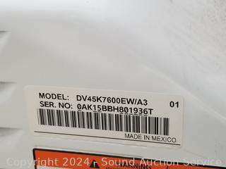 Pulled from the home working. Model DV45K7600EW/A3, Serial OAK15BBH801936T. 42.5" H x 27" W x 27.5" D. Signs of wear from use.