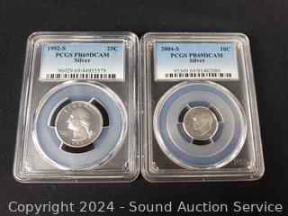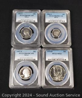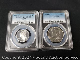 2004S Roosevelt Dimes-Silver PR69DCAM, 1992S Washington Quarter-Silver PR69DCAM, 1997S Washington Quarter-Silver PR69DCAM, 1970D Kennedy Half Dollar MS63. ATTN: We are not coin or currency experts or graders, please use your own judgement when bidding.