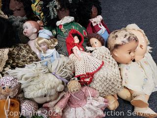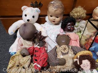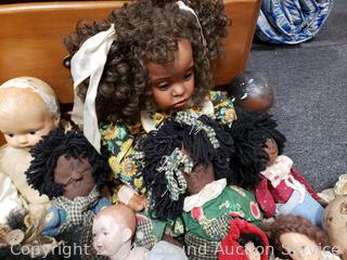 Black Americana, cloth body monkey, several old dolls with some damage/cracking/crazing, one of the black porcelain dolls has a broken foot. Refer to photos for more details.