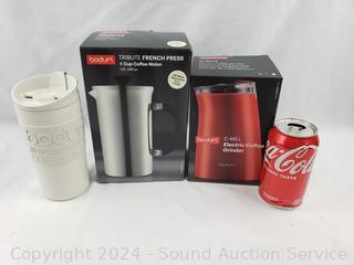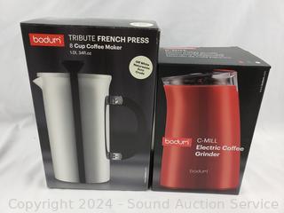 Lot #0105: Budum Coffee Press, Elec. Coffee Grinder, 12oz Mug Tribute Set