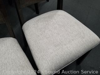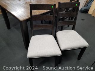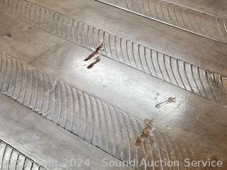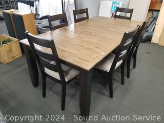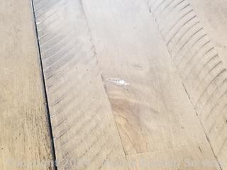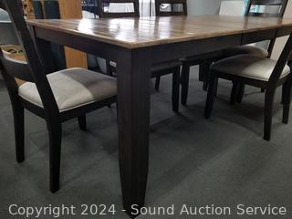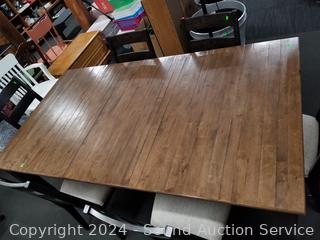 Table has a few gouge spots in the top, some minor scuffs, otherwise in good condition, 1 chair has a large water? stain spot, hard to make out, some scuffs, scratches in finish. Don't see any other issues. Comes with (1) 18" leaf. 30" H x 42" W x 77.5" long (with leaf).
