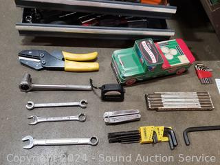 Wrenches, hex keys, tape measures, nut wrenches, sockets, drill bits, electrical tape & more. Refer to photos for more details.