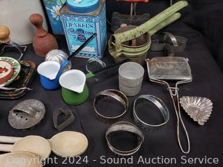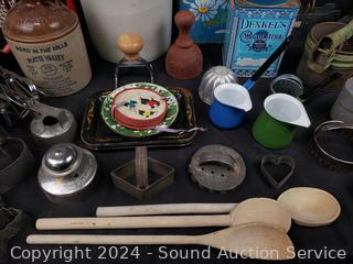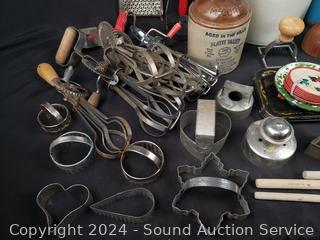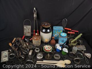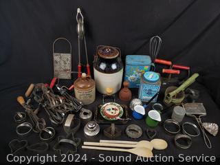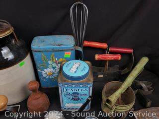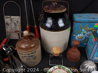 Lot #0028: Vintage Pottery Crock, Tins & Various Utensils