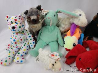 1996 Hippity, 1996 Strut, 1999 TY 2K, 1997 Iggy, 2002 Lightning, 1999 Slippery, 2000 Glow, 2000 Howl, 1998 Stinger, 1999 Knuckles, 1999 Lips, 1993 Pinchers, 1996 Congo, 1996 Fleece, 2009 Sheep, 2001 October, 2002 Lightning, 1993 Quakers, 1993 Ant Eater, 2001 November. Some dirty spots.