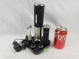 Has power, appears to be functioning as intended. Comes with Elec. corkscrew (some tape residue), aerator/pourer, preserver, 2 stoppers, foil cutter, drip collar, charging base.