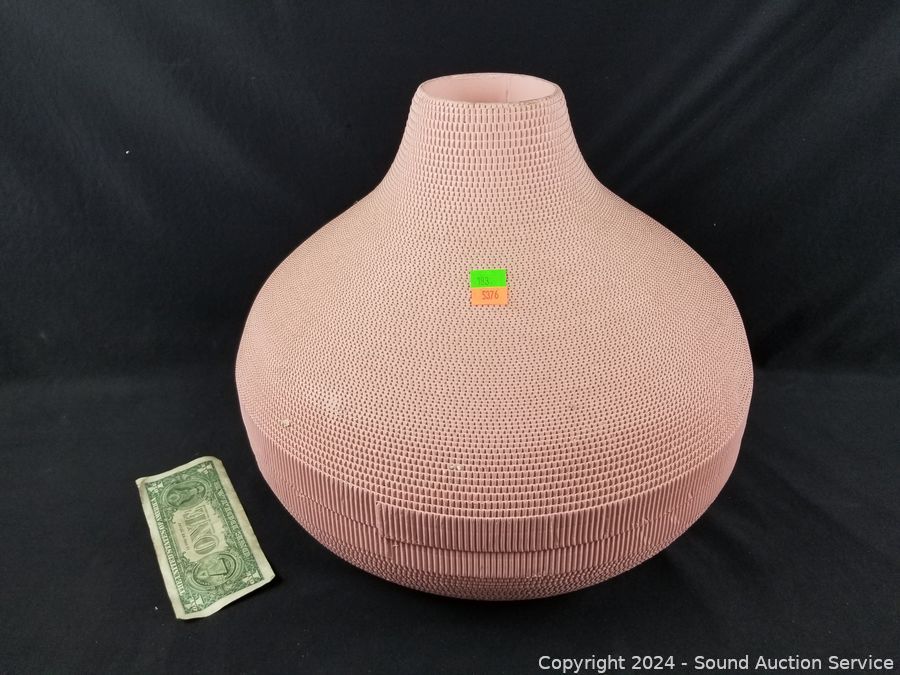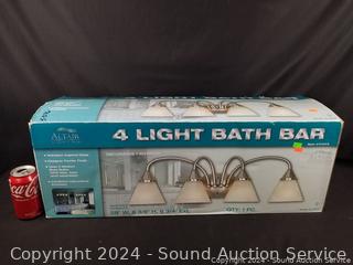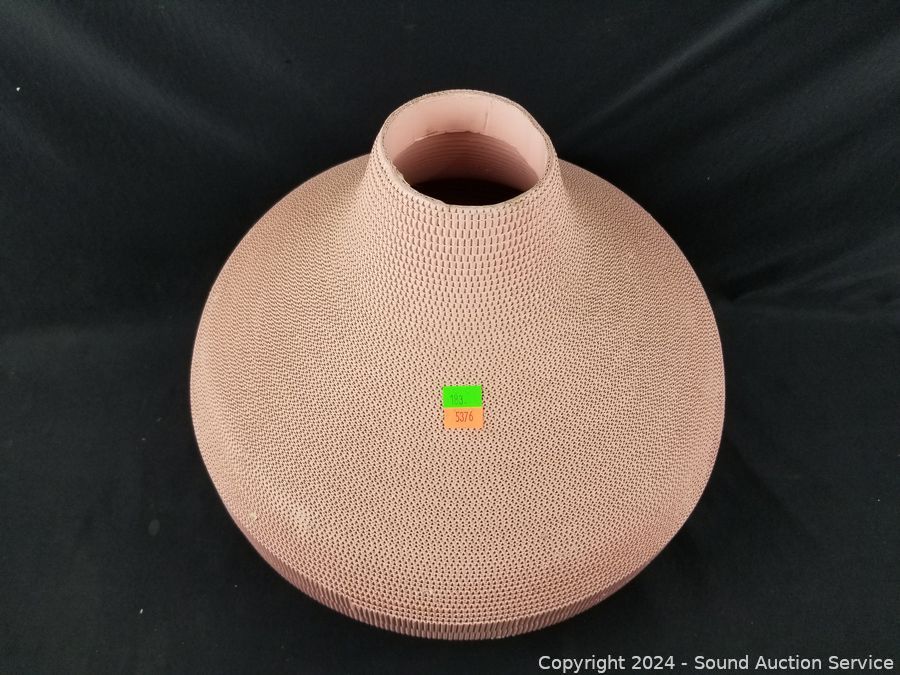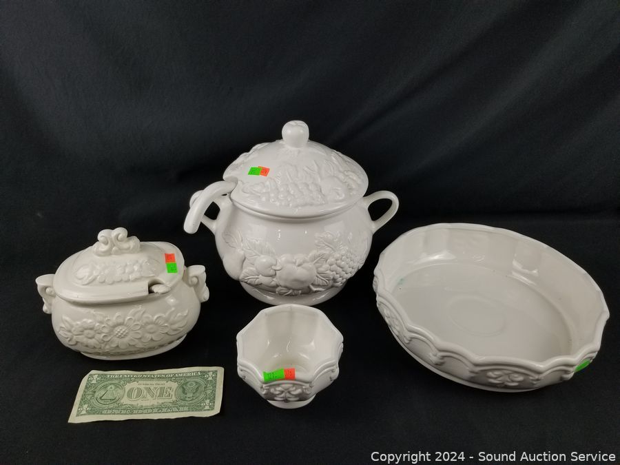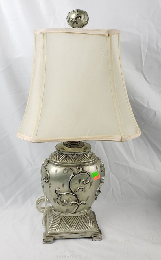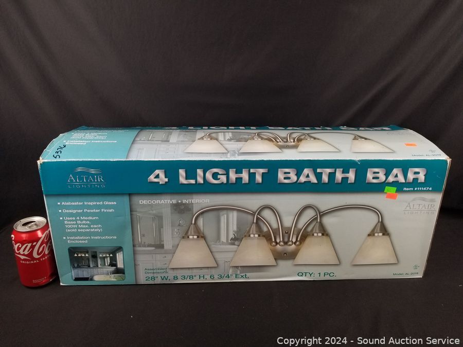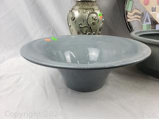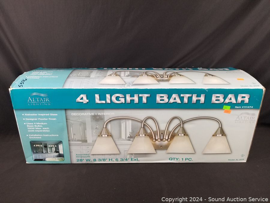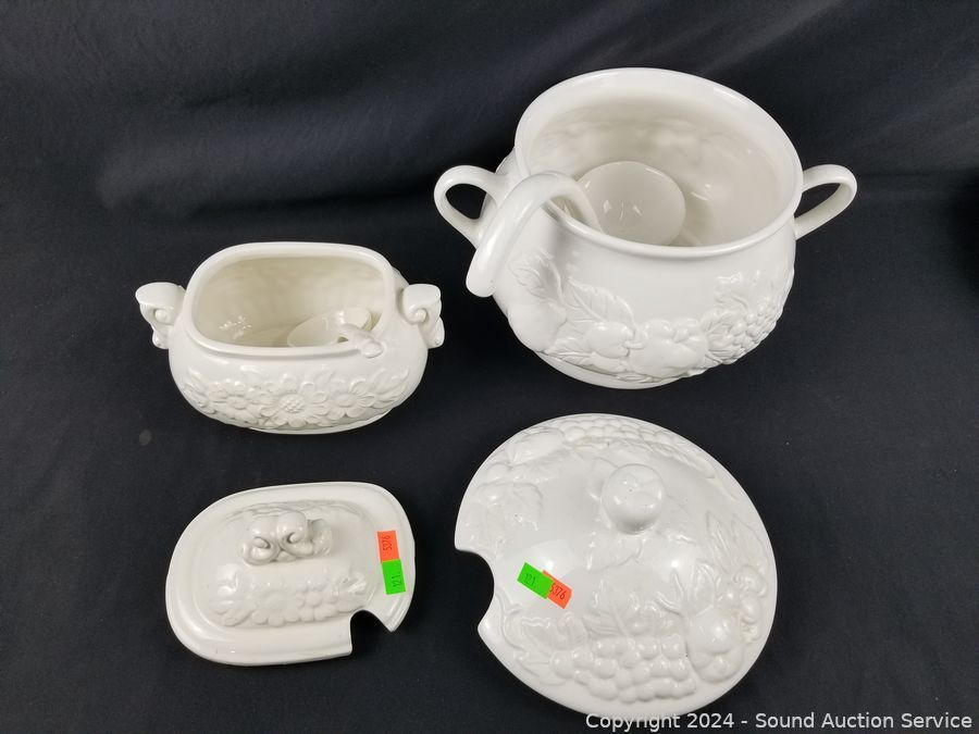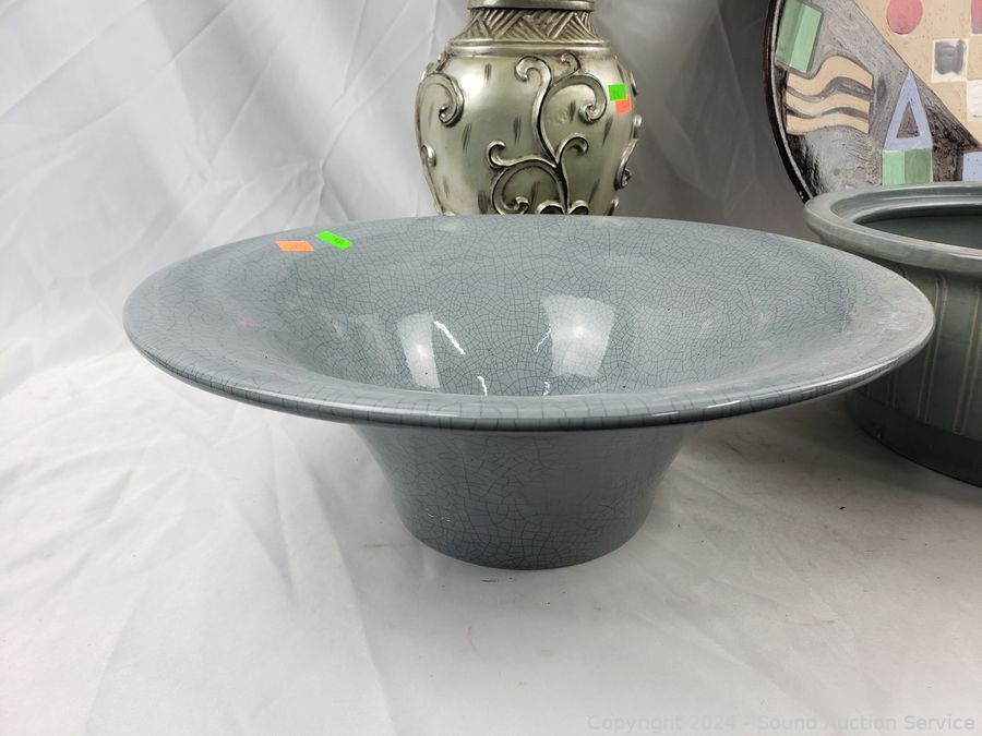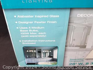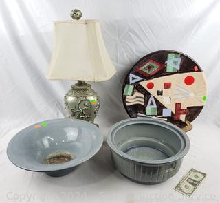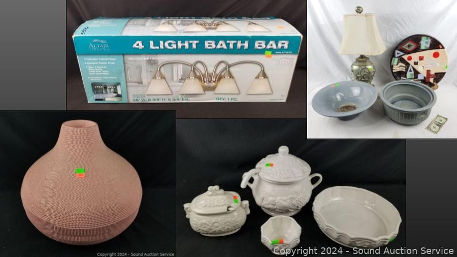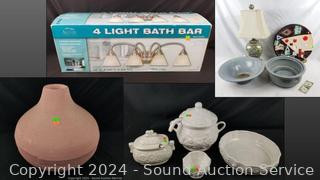 4pc White Grape Print Serving Dishes - Soup tureen, w/ladle, 10" centerpiece bowl, small covered dish w/ladle, 4" dish. Some crazing, don't see any major issues. Altair Pewter Finish Alabaster Glass 4-Light Bath Bar - Appears to be functioning as intended. No hardware. 8-3/8" H x 28" L x 6-3/4" W. Silver Decorative 22" Lamp & 3pc Decorative Pottery Bowls, Plates - Lamp appears to be functioning as intended, 12" to 14" Dia. bowls/plates. Unique Stripped Cardboard Decorative Vase, Light Shade? - 12" H x 14" Dia. Has a threaded hole in the bottom.