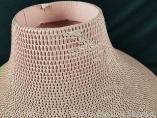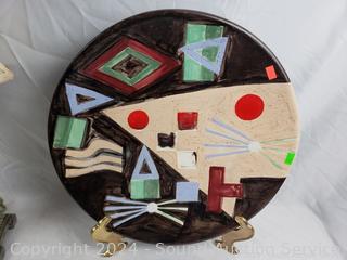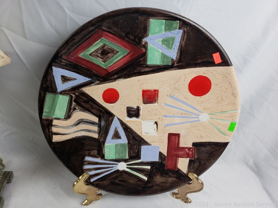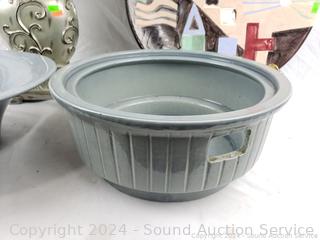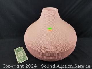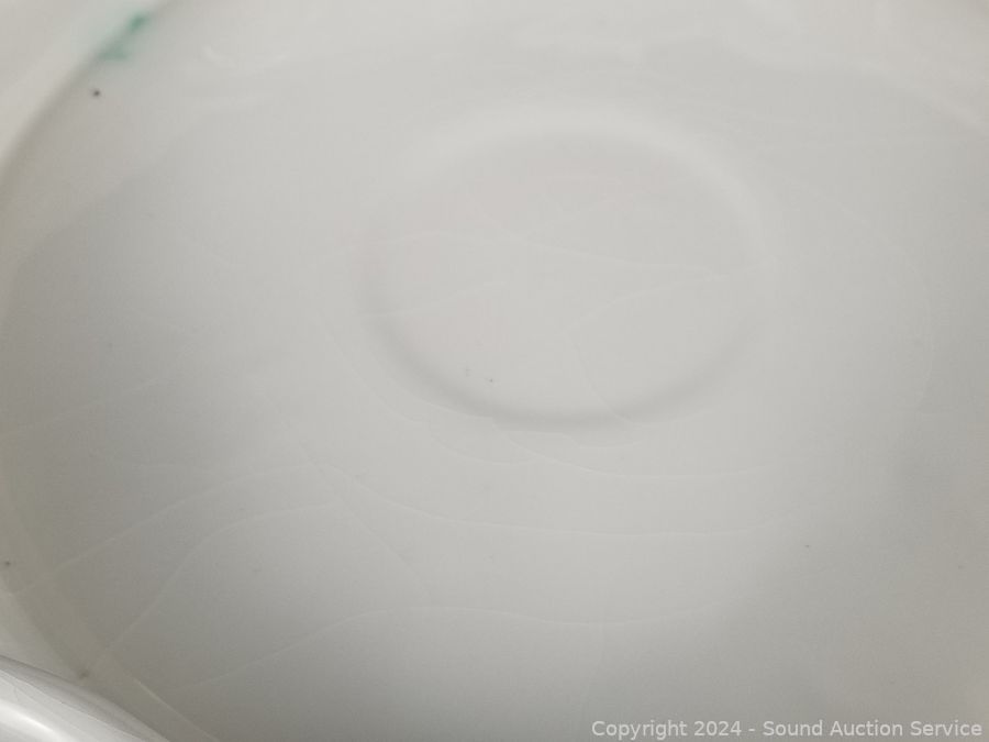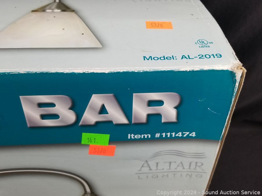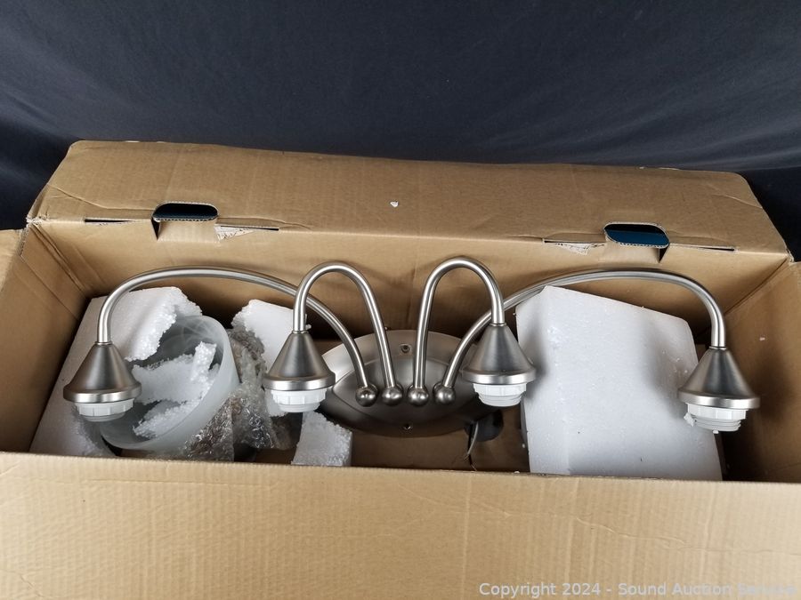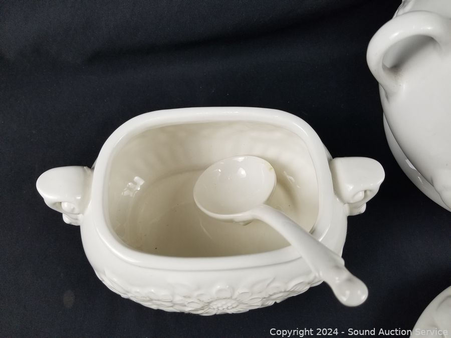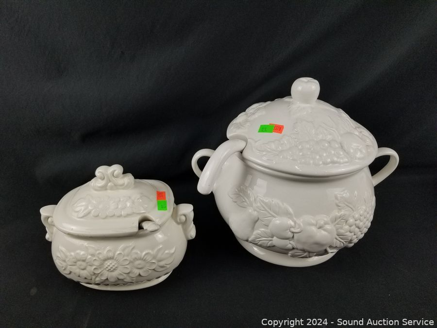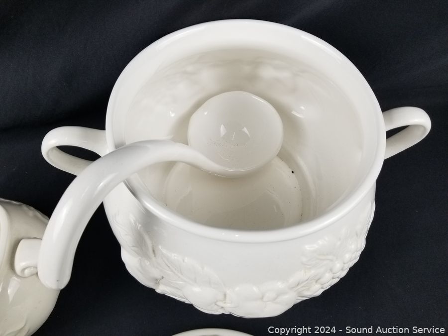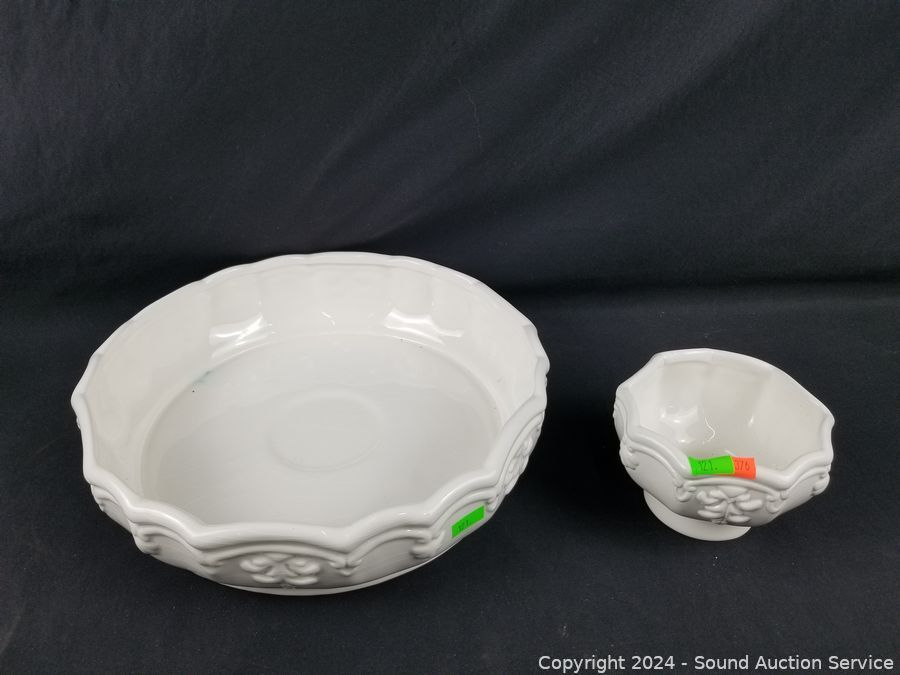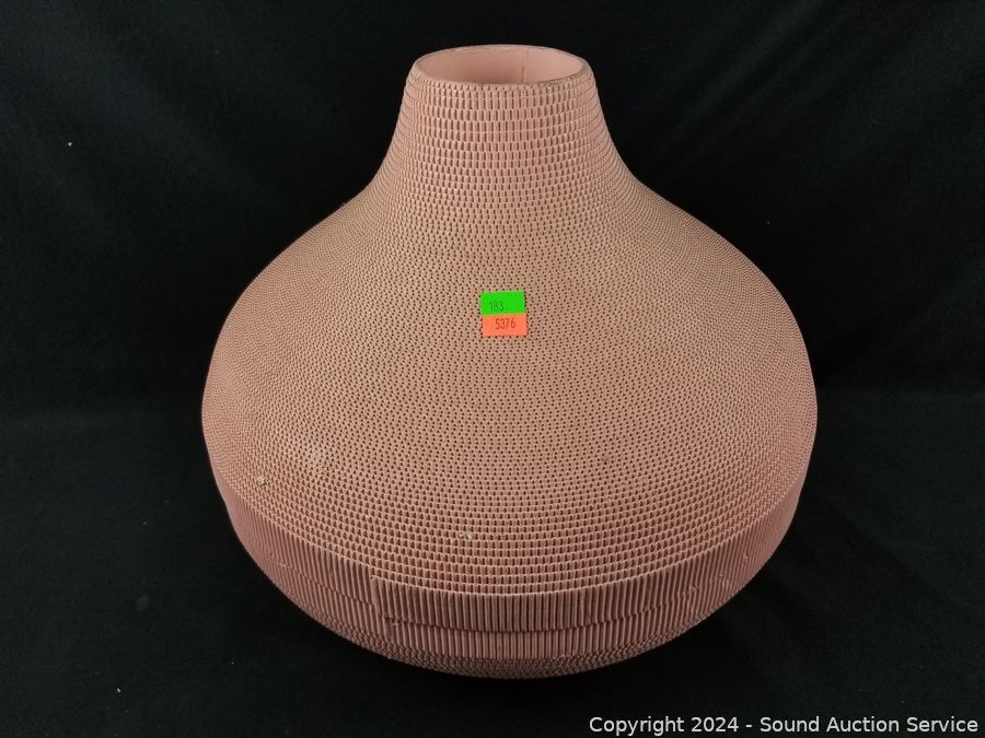 4pc White Grape Print Serving Dishes - Soup tureen, w/ladle, 10" centerpiece bowl, small covered dish w/ladle, 4" dish. Some crazing, don't see any major issues. Altair Pewter Finish Alabaster Glass 4-Light Bath Bar - Appears to be functioning as intended. No hardware. 8-3/8" H x 28" L x 6-3/4" W. Silver Decorative 22" Lamp & 3pc Decorative Pottery Bowls, Plates - Lamp appears to be functioning as intended, 12" to 14" Dia. bowls/plates. Unique Stripped Cardboard Decorative Vase, Light Shade? - 12" H x 14" Dia. Has a threaded hole in the bottom.
