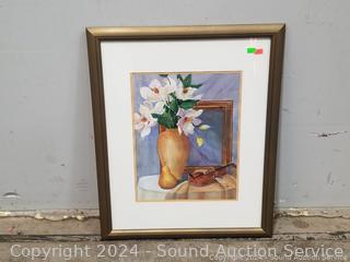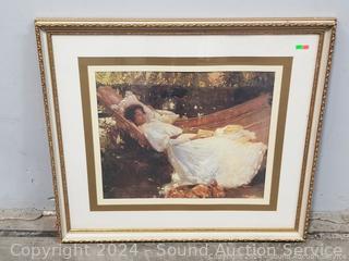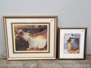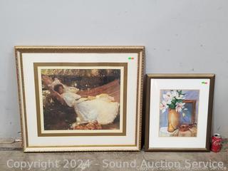 Lot #0125: Golden Frame Lady in Hammock Print & Original Still Life Watercolor