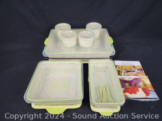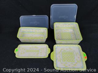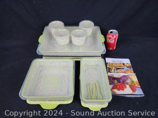 All come with trivets & lids, large baking pan comes with steel rack. Appear new, unused. Includes loaf pan, 8" x 8" & 9" x 13" casserole/baking pans.