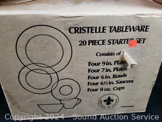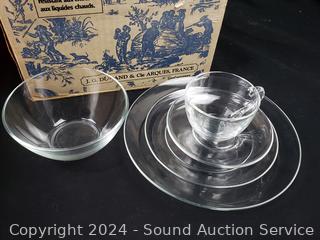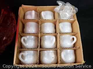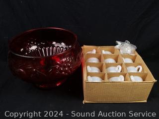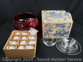 Lot #0235: Arcoroc Clear Glass Dish Set, Ruby Punch Bowl, 12 Milk Glass Cups