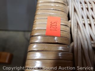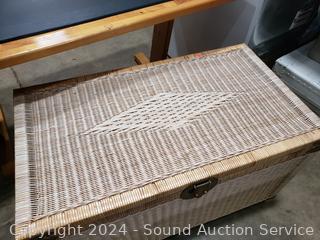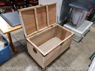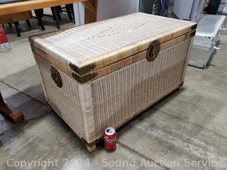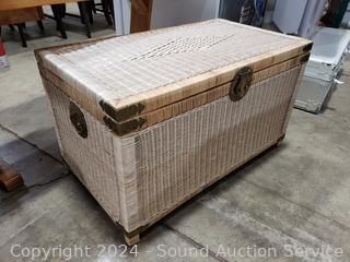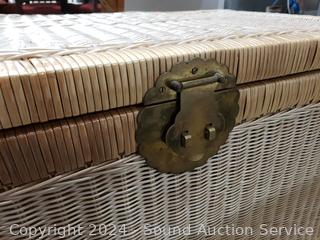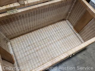 Each piece is individually wrapped in plastic to keep wicker from breaking, with brass hardware. In great condition. 20" H x 36" x 20".