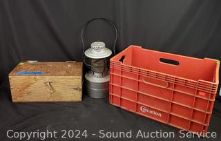 Lot #0133: Vtg. Handlan Inc. Lantern w/Wood Case & Orange Crate