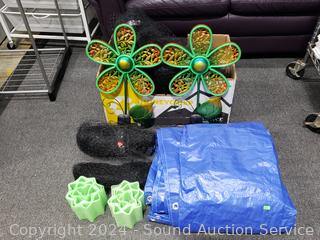 108" x 132" blue tarp (has some wear, dirty, small holes), various bird netting, unknown widths/lengths, sunflower stakes.
